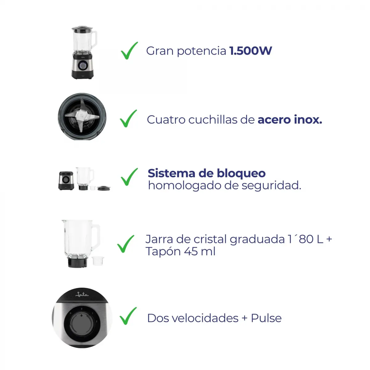 Copo em vidro 1,5 L2 velocidades + pulseEstrutura e lâmina em aço inoxidávelCopo desmontável com graduação milimétrica