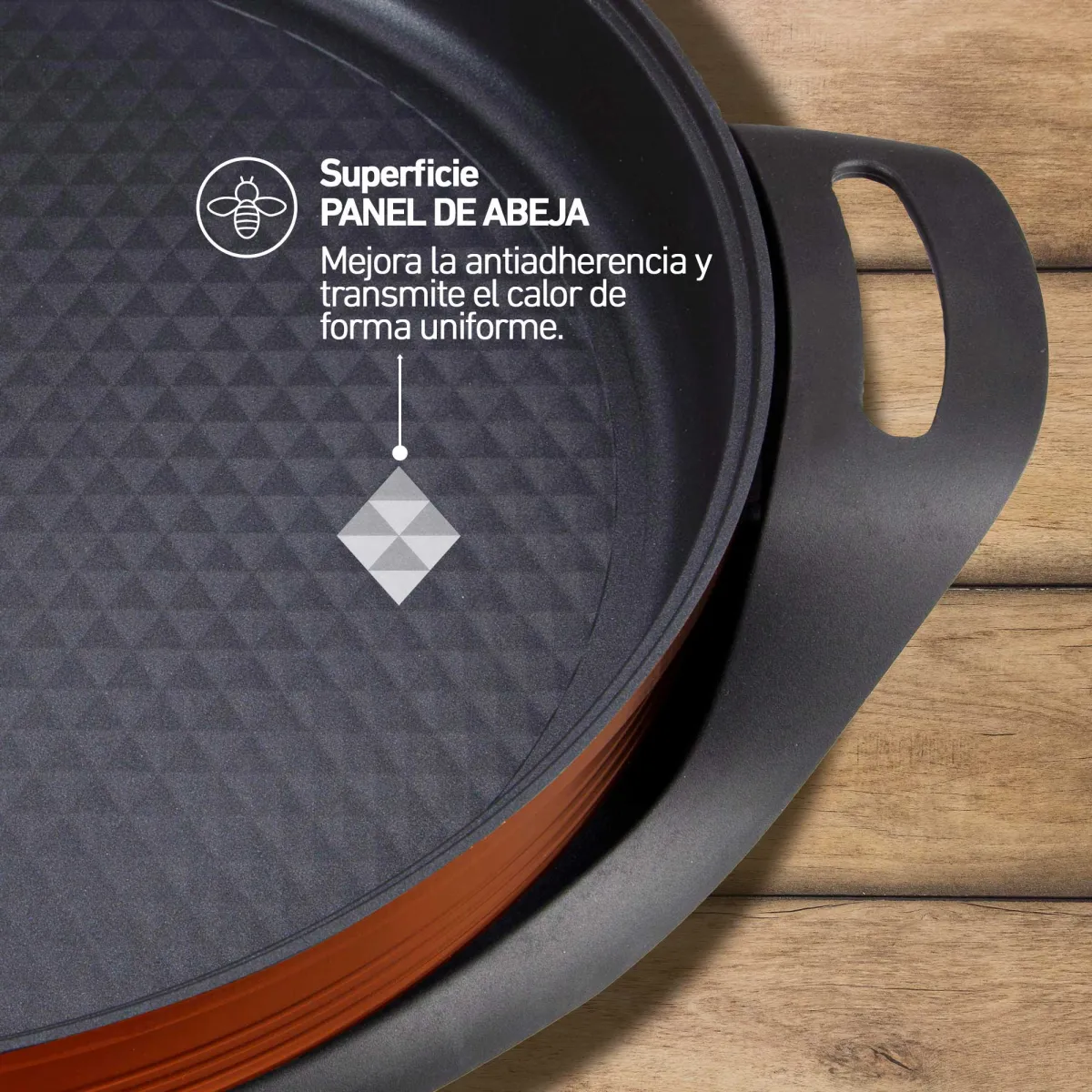 Panela elétrica de paella com superfície em forma de favo de mel que melhora sua antiaderência e transmite calor de maneira uniforme Cobertura antiaderente livre de PFOASuperfície painel de abelhaTermóstato regulávelTampa de vidro