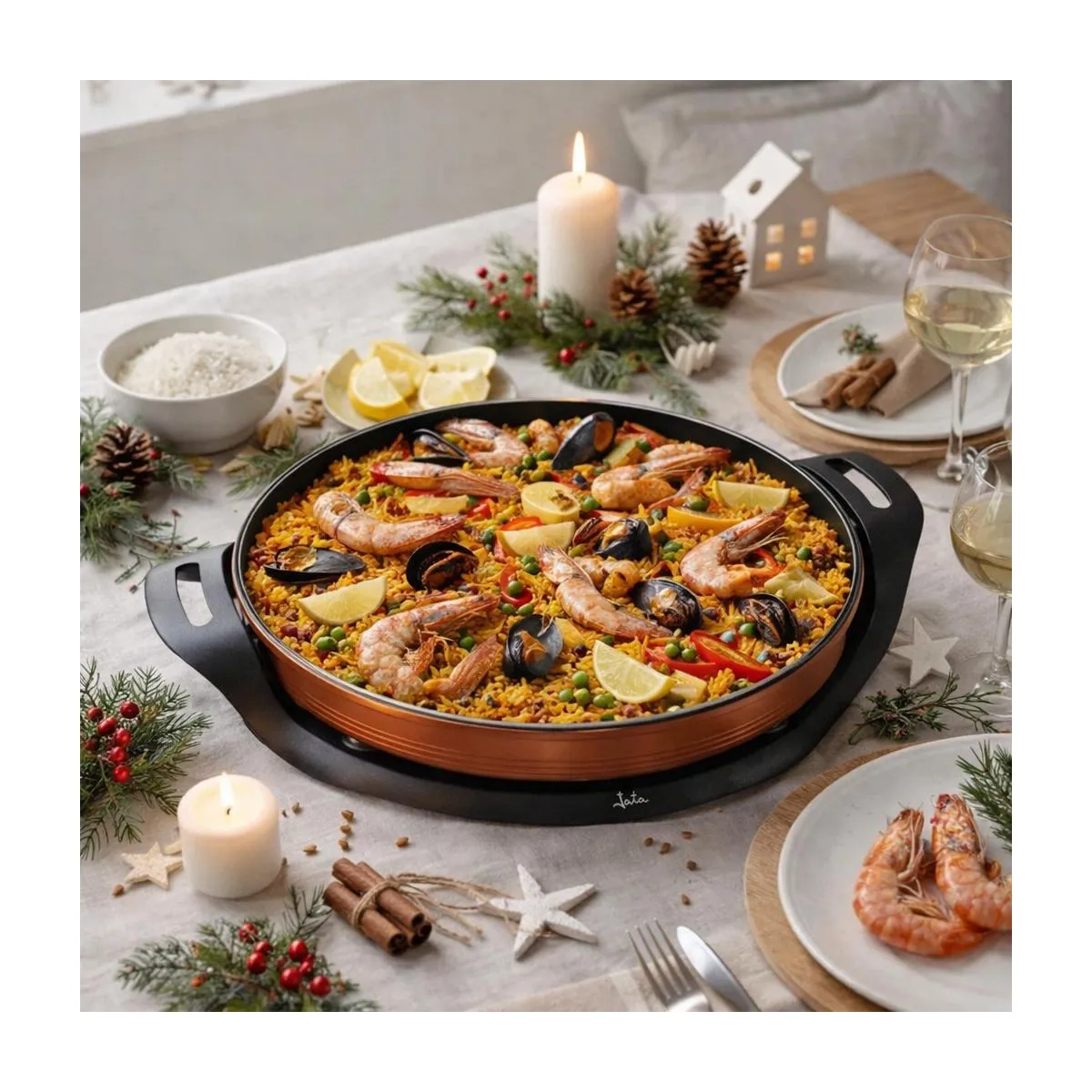 Tacho-grigideria eléctrica. Diámetro 55 cm. Especial para grandes paelhas, estufados, ... Temperatura uniforme em toda a superficie. Cobertura antiaderente isento de PFOA