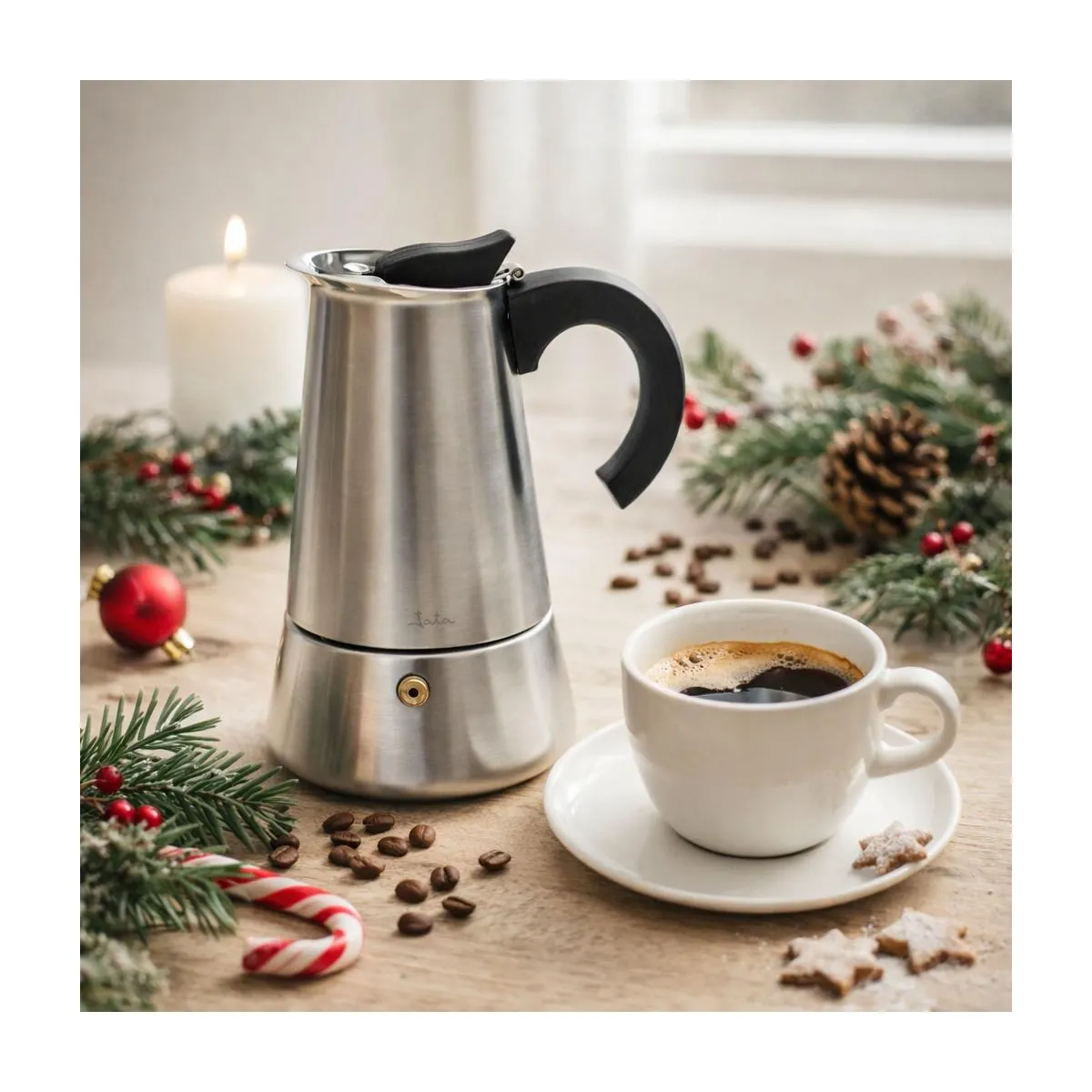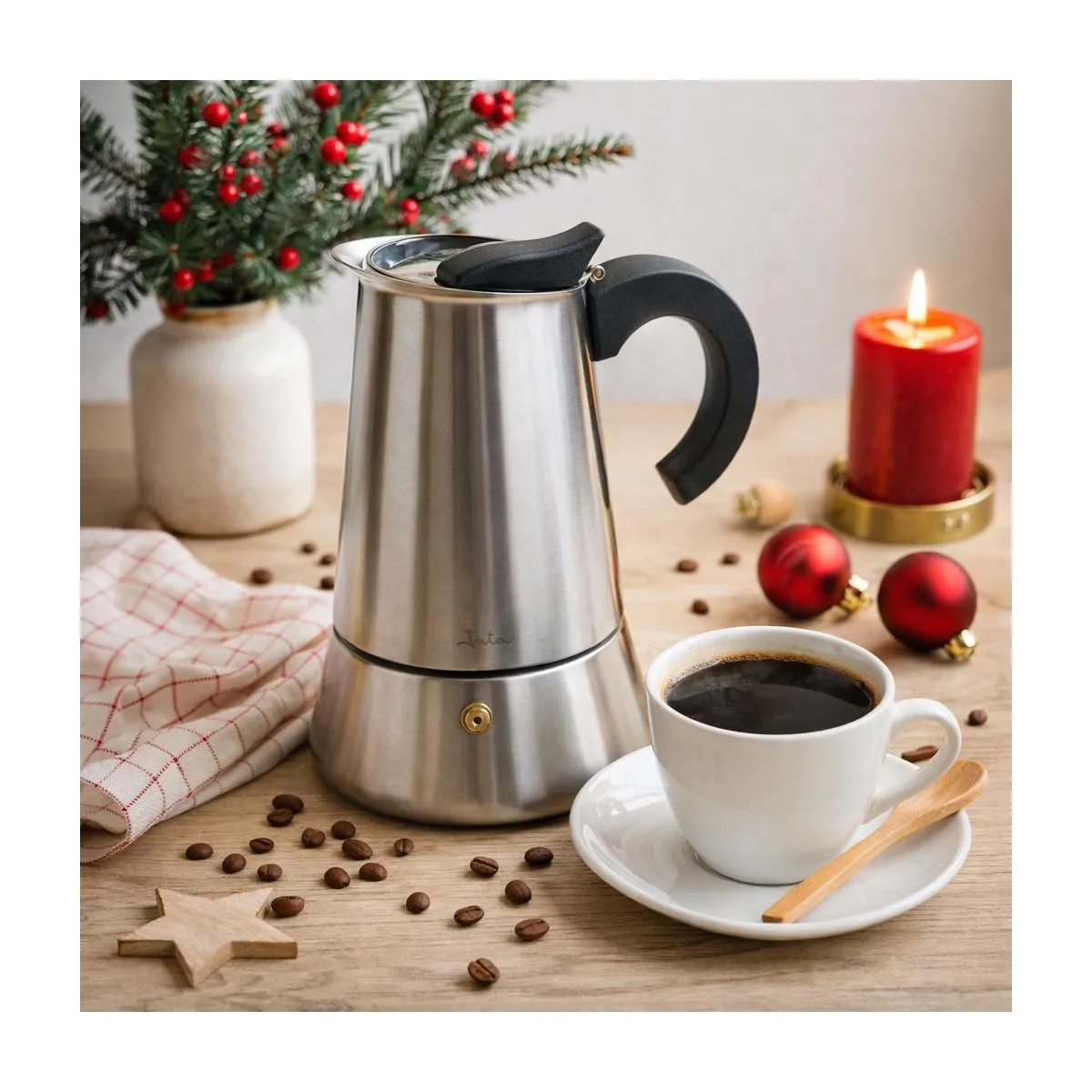 Brew fresh coffee in the Jata induction coffee maker and add a touch of vulcan red to your kitchen