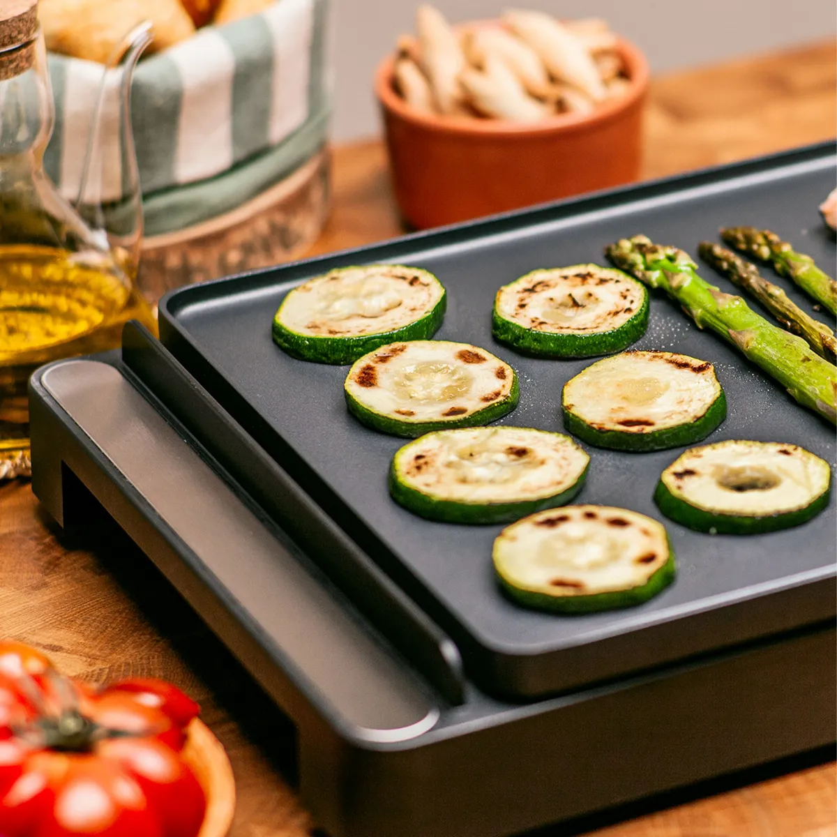 The electric roasting griddle GR204N has a large ceramic anti-adherent surface, PFOA-free.