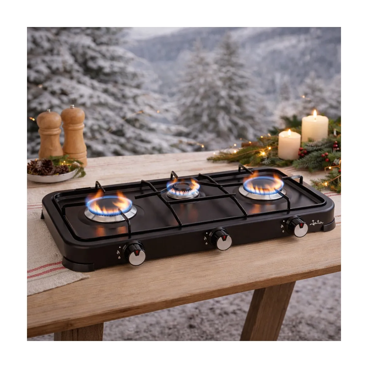 The JECG2703 gas cooker is ideal for your camping days, it has three burners suitable for butane or propane
