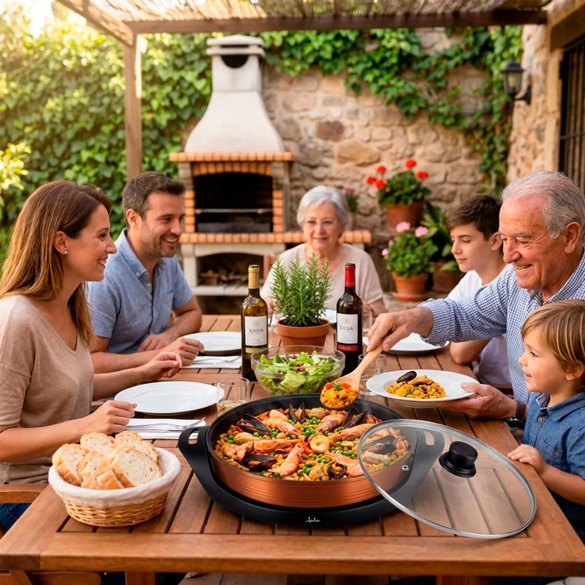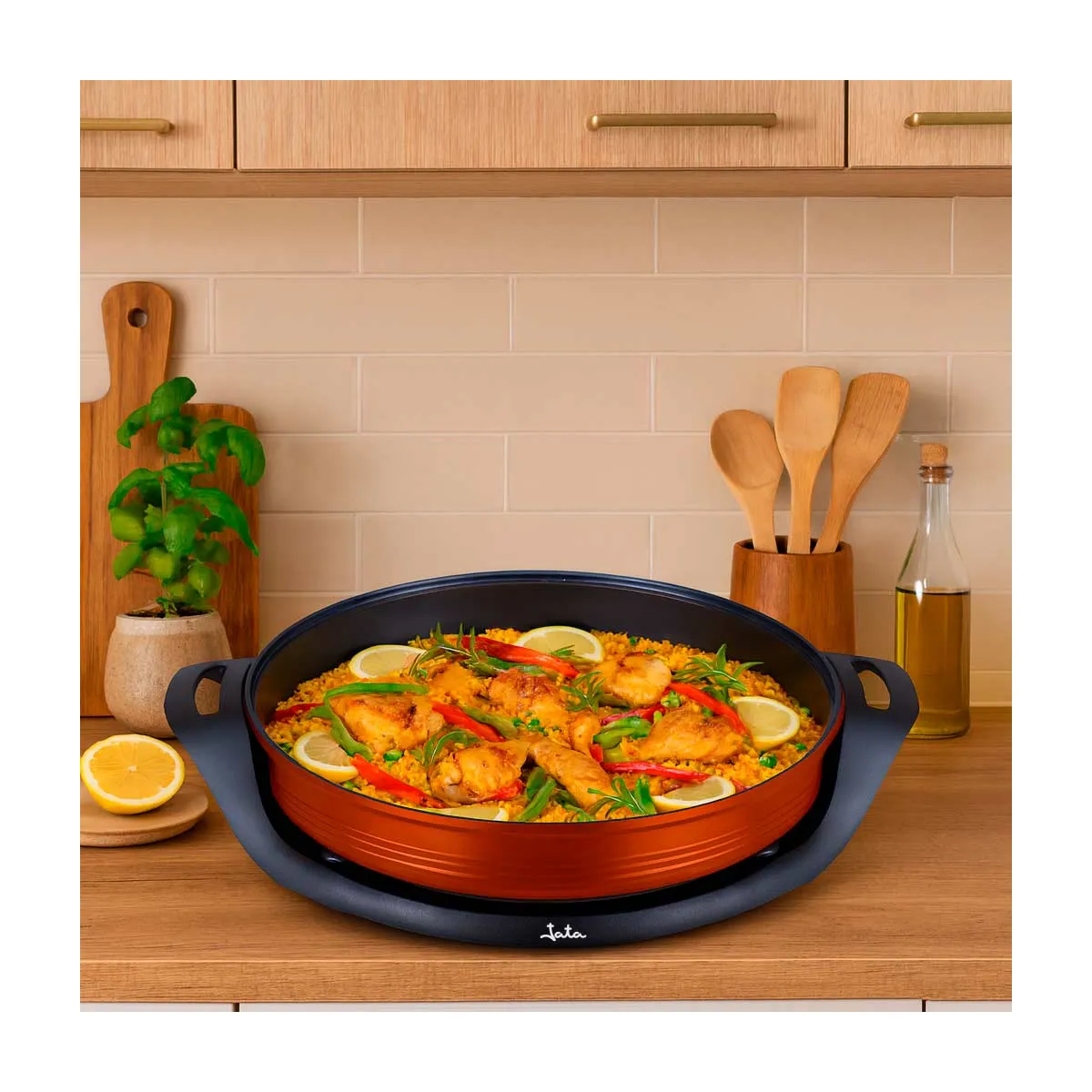 Electric paella pan with a honeycomb surface that improves its antiadherence and transmits heat evenly