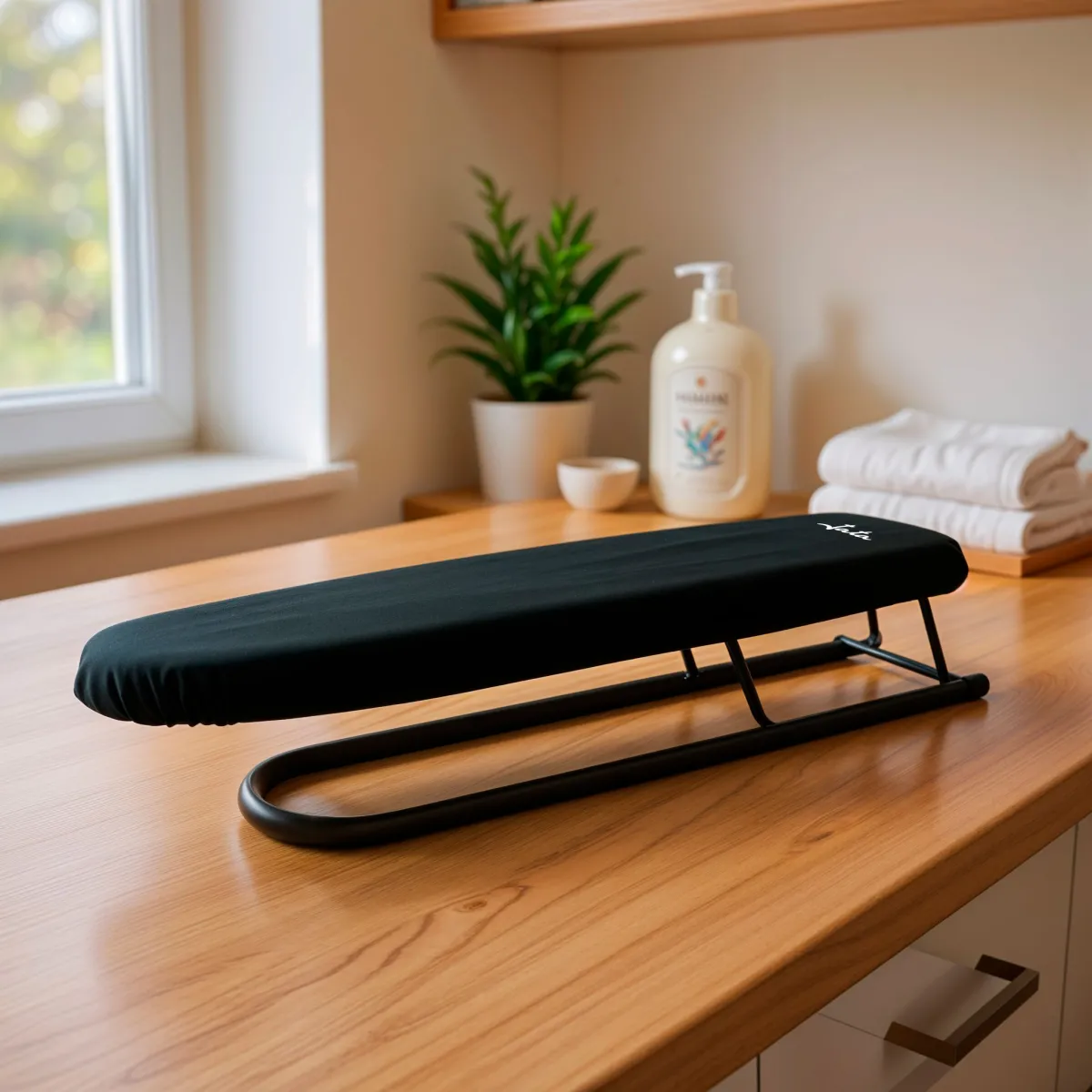 A big ironing surface, aluminium structure with anti-corrosion treatment and foldable for easy storage.