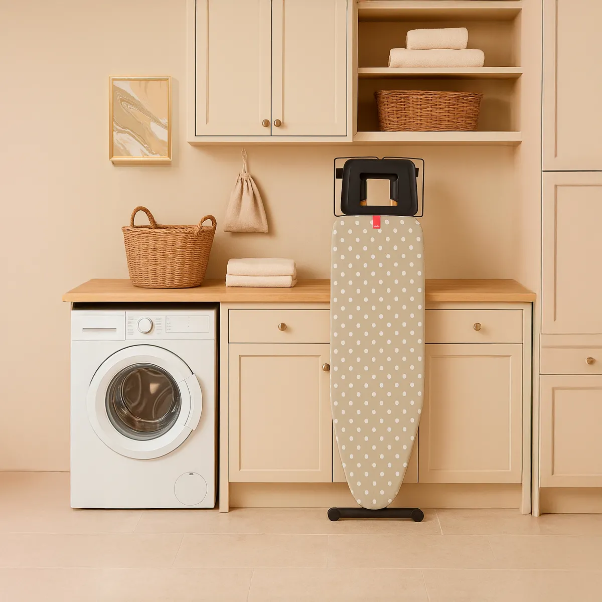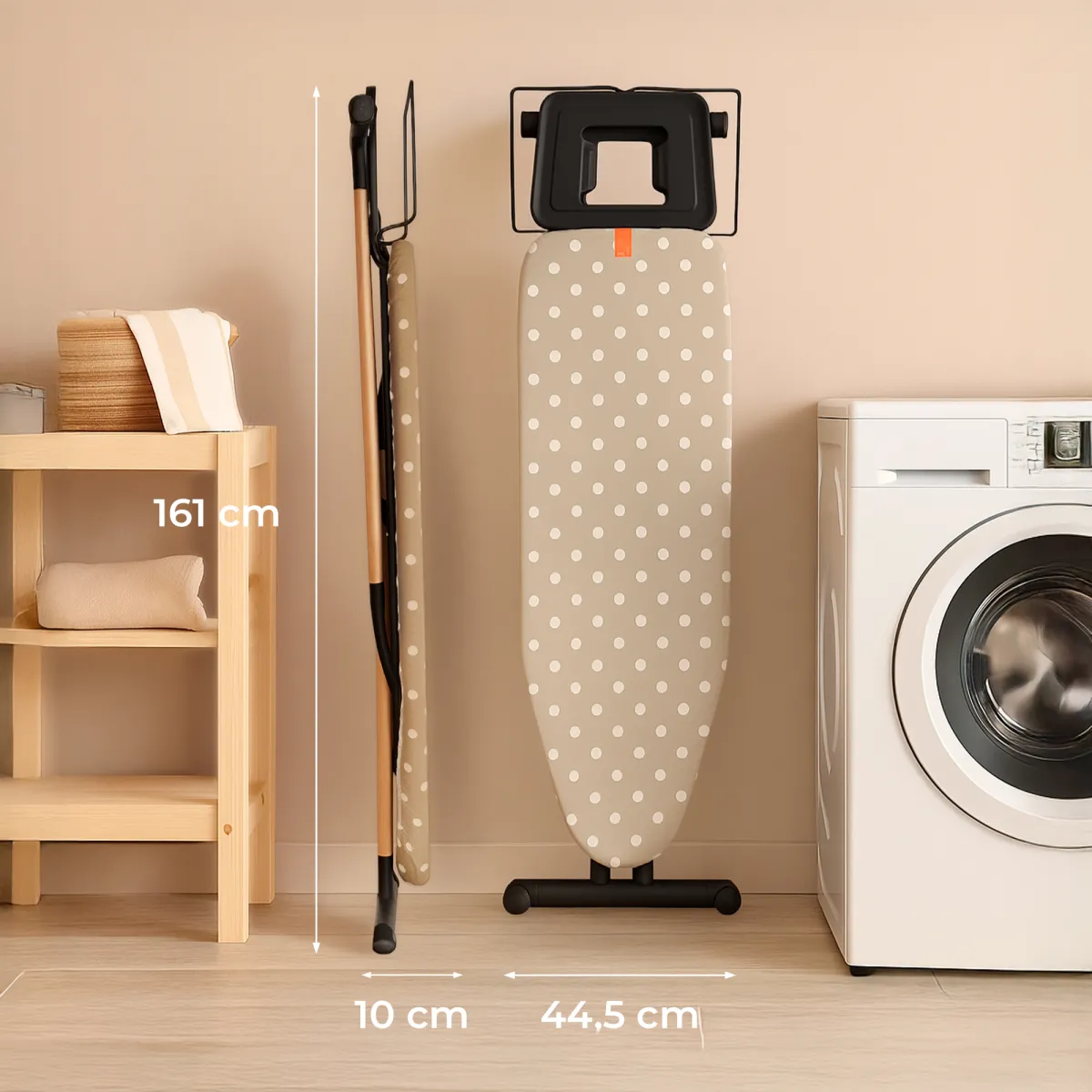 A big ironing surface, aluminium structure with anti-corrosion treatment and foldable for easy storage.