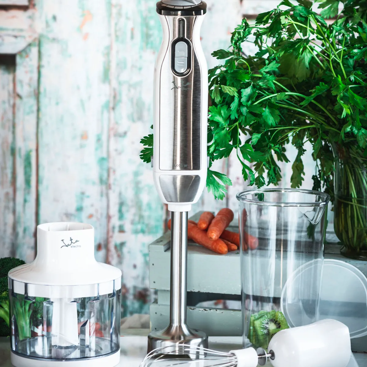 Great power 1.000 WElectronic speed control knobRemovable stainless-steel stickWhisker, chopper and measure cup, included